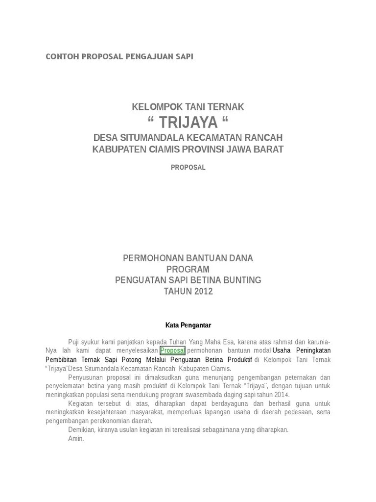 Pengajuan proposal hanya dilayani untuk kelompok tani ternak dengan ketentuan. Untuk meningkatkan pendapatan peternak dan keluarganya 2. Sapingi ketua kepala desa kertaraharja jaya lembar pengesahan proposal permohonan bantuan ternak sapi nama kelompok : Kelompok ternak sapi mata jaya. Proposal permohonan bantuan modal usaha budidaya ternak sapi.